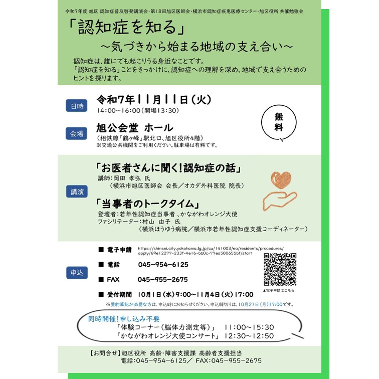 - 11/11 令和7年度 旭区 認知症普及啓発講演会 「認知症を知る」 ~気づきから始まる地域の支え合い~