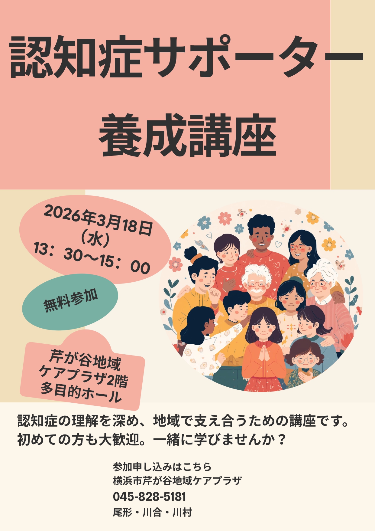 2026年1月13日 / 最終更新日時 : 2026年1月13日 kosuga 新着 3/18 認知症サポーター養成講座(芹が谷CP)【認知症サポーター養成講座のお知らせ】 港南区で開催される認知症サポーター養成講座のお知らせです。【概要】開催日2026年3月18日(水)時間13時30分~15時00分場所横浜市芹が谷地域ケアプラザ 2階 多目的ホール(横浜市港南区芹が谷2-16-12)問い合わせ横浜市芹が谷地域ケアプラザ045-828-5181(尾形・川合・川村)