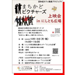 - 10/13 まちかどピクチャーズ上映会 in にしとも広場【イベントのお知らせ】 認知症カフェ動画プロジェクト「まちかどピクチャーズ」上映会のお知らせです。 【開催概要】名 称:まちかどピクチャーズ上映会 in にしとも広場 日 時:2025年10月13日(月・祝) […]